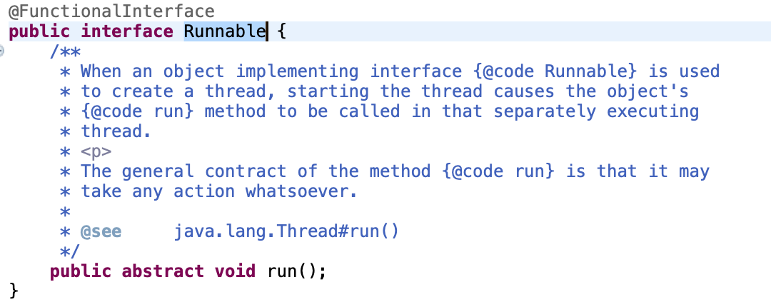 Runnable 객체나, Runnable을 인수로 받는 메서드에 우리가 람다식을 넘기고 싶을 때, 해당 람다식이 Runnable의 시그니처인 "인수가 없으며, void를 반환하는" 형태여야만 한다는 의미이다.